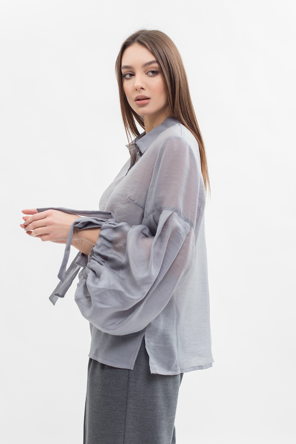 Легка блузка в романтичному стилі з тонкого тенселу. Модель прямого силуету має відкладний комір зі стойкою та застібку на ґудзики. Особливість моделі - неймовірні об'ємні рукави зі складками та куліскою і зав'язками.